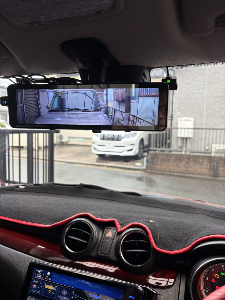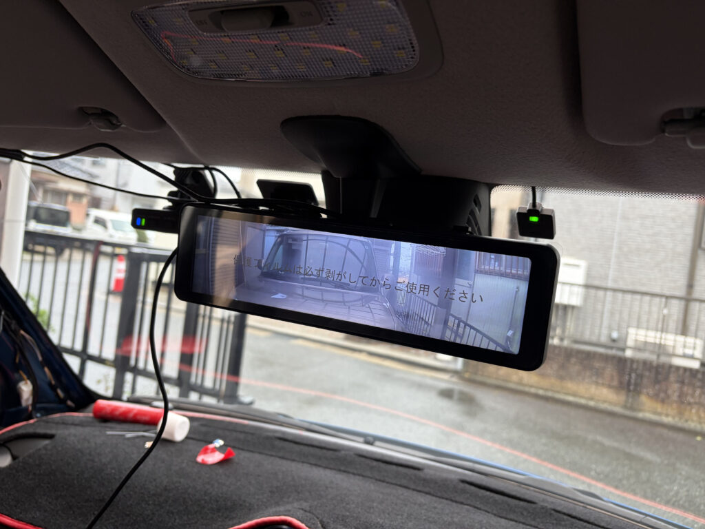 ドラレコとミラーをいい位置に取り付けて動作の確認をします。