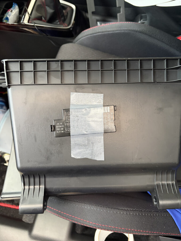 ヒューズボックスの蓋ははまらなくなるのでグローブボックスの背面に養生テープで貼り付けておきました。